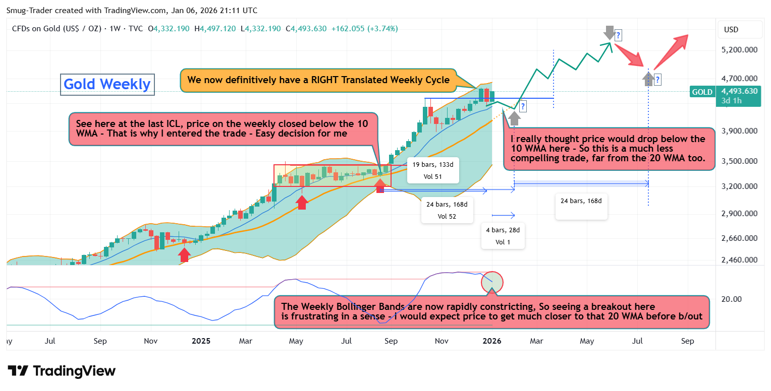 PM's - *Trade Alert*Unexpected strength during the weakest period in the Weekly Cycle cannot be ignored.SimonJan 06, 2026∙ Paid96ShareThis is a quick article as I am in transit during my annual winter pilgrimage in Scotland.Here is the all-important Weekly Gold chart:If you look at the last charts I emailed, I highlighted the expec…Continue reading this post for free, courtesy of Simon.Claim my free postOr purchase a paid subscription.Previous